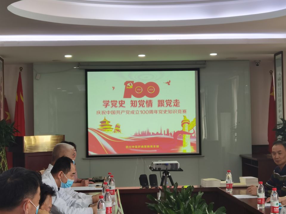 为庆祝中国共产党成立100周年,重温中国共产党光辉历程,推动全院广大职工深入扎实学好百年党史,做到学史明理、学史增信、学史崇德、学史力行,学党史、悟思想、办实事、开新局,四川中医肝病医院于4月27日下午开展“学党史,知党情,跟党走”党史知识竞赛,参与此次活动的党员干部有蜀汉街社区党委邱春书记和胡挺副书记、四川中医肝病医院党支部书记罗丽芬、四川中医肝病医院王积分院长、蔡邦镇院长等同志。